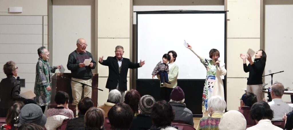 SKETCHクラブの石垣裕子さんの「絵本が出来るまで」、熊谷の「あっちゃんも、音楽付き朗読」、6才で被爆した絵本の主人公「小谷孝子さんとあっちゃんのコーナー」、「青い地球(ほし)の賛歌」歌唱、会場のみなさんとの大盛り上がりの「ふるさと」合唱。