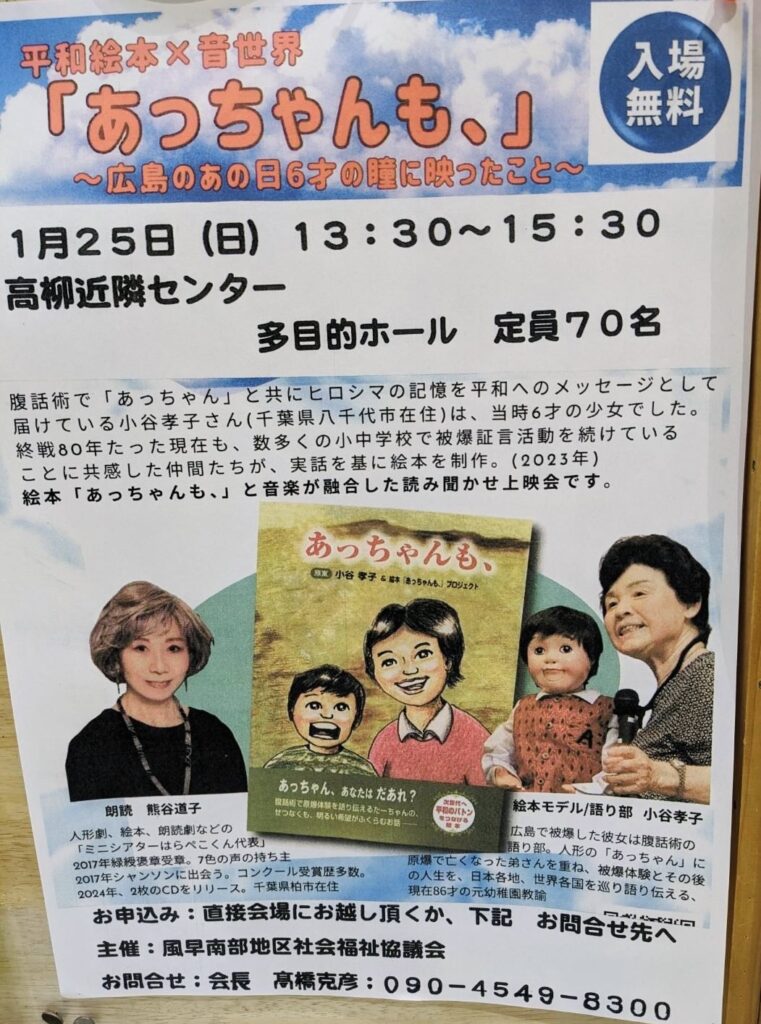 SKETCHクラブの石垣裕子さん、そして6才で被爆した「あっちゃんも、」絵本の主人公、小谷孝子さん、協力者さんたちとの上映会です。