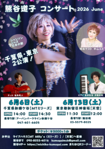千葉県・東京2会場でのソロコンサート。こちらは千葉県鎌ケ谷市新鎌ケ谷の【MT MIlly’s(MTミリーズ)】のお申込です。2026年の1stソロコンサートは “シャンソン界のレジェンド歌手” 中山エミさんをお迎えいたします。共演者は昨年11月のコンサートで会場のお客様に驚きと感動を届けたピアノとチェロ、伊藤辰哉さん、飯島奏人さんのコンビが再来!熊谷道子の新曲、未発表曲、中山エミさんとの楽しい企画など。乞うご期待!入場料5000円(税込み)1ドリンク別。自由席です。