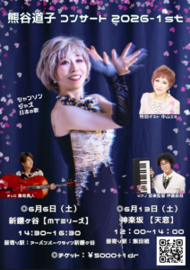 千葉県・東京2会場でのソロコンサート。こちらは東京都新宿区神楽坂のライブハウス【天窓 てんまど】のお申込です。2026年の1stソロコンサートは “シャンソン界のレジェンド歌手” 中山エミさんをお迎えいたします。共演者は昨年11月のコンサートで会場のお客様に驚きと感動を届けたピアノとチェロ、伊藤辰哉さん、飯島奏人さんのコンビが再来!熊谷道子の新曲、未発表曲、中山エミさんとの楽しい企画など。乞うご期待!入場料5000円(税込み)1ドリンク別。自由席です。